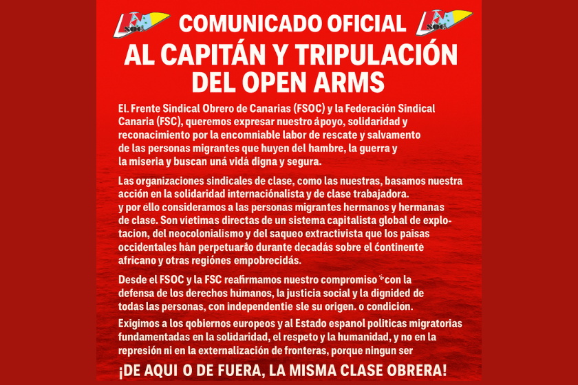 El Frente Sindical Obrero de Canarias (FSOC) y la Federación Sindical Canaria (FSC) expresamos nuestro más firme apoyo, solidaridad y reconocimiento al capitán y a toda la tripulación del Open Arms por la encomiable labor humanitaria que realizan en el rescate y salvamento de personas migrantes que, huyendo del hambre, la guerra y la miseria, buscan una vida digna y segura.