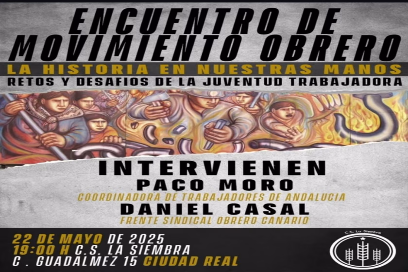 Intervinieron: – Paco Moro, de la Coordinadora de Trabajadores de Andalucía. – Daniel Casal, del Frente Sindical Canario. Día 22 de Mayo. Hora 19 horas. En el Centro Social La Siembra., C/Guadalmez 15, Ciudad Real.