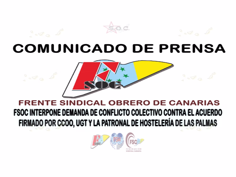 Desde el Frente Sindical Obrero de Canarias (FSOC) informamos públicamente que hemos interpuesto una demanda de Conflicto Colectivo contra el acuerdo firmado el pasado 12 de abril de 2025 entre los sindicatos CCOO y UGT y la Patronal de Hostelería de la provincia de Las Palmas.