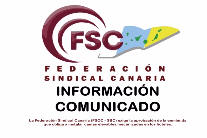 La Federación Sindical Canaria –compuesta por los sindicatos FSOC y SBC– hace un llamado firme al Parlamento autonómico de Canarias para que apruebe, sin dilaciones ni sustituciones, la enmienda a la Ley de Ordenación del Turismo que establece la obligatoriedad de instalar camas elevables mecanizadas, así como los carros motorizados en los establecimientos turísticos del archipiélago.